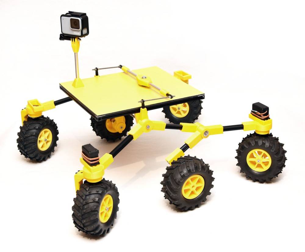 La parte mecánica es un curioso mecanismo con balancines llamado rocker-bogie y una barra estabilizadora que equilibra los trenes de ambos lados. Tiene 6 ruedas motrices y 4 ruedas directrices. Según NASA es capaz de superar obstáculos dos veces el diámetro de la rueda.